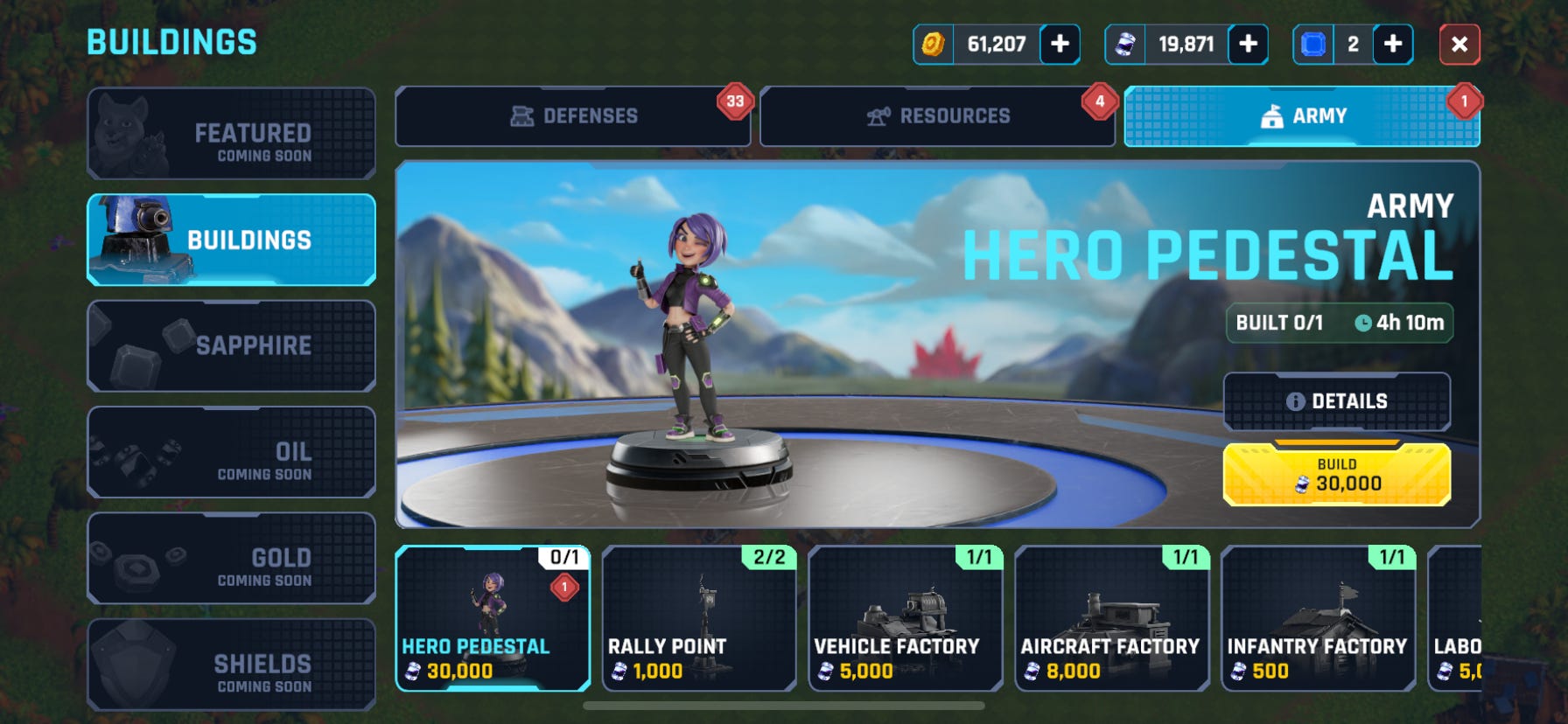 Depending on your headquarters’ level, you’ll be able to recruit infantry, aircraft, and hero units.